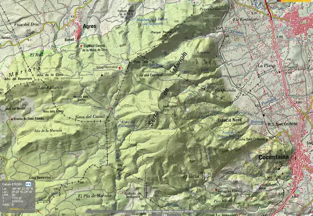 De las diversas formas con las que se puede enfocar un ruteo por estos lares me decidí por una de fuerte desnivel pero que me llevara a "sentir" las cimas más altas así como el agua que de numerosas fuentes emergen por diferentes puntos de la sierra. En consecuencia el punto ideal de partida era la localidad de Cocentaina y más en concreto La Ermita de San Cristofol, lugar en el que además se inicia la PR CV 37 que de subida emplearé un pequeño tramo y de bajada casi en su totalidad.