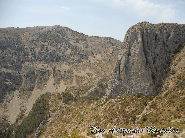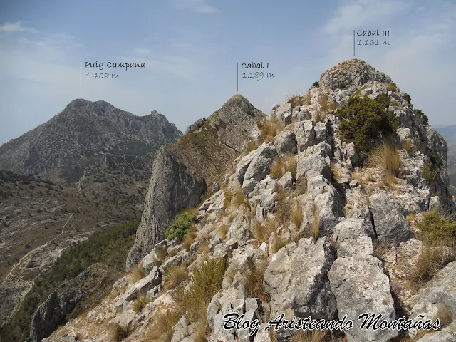 El Penyó Cabal pone fin por el sureste a la sierra de Aitana. Su abrupto relieve se levanta sobre los barrancos del Salt, que lo separa de la cresta del Carrascal, y de Gulabdar, que lo separa del Monte Ponoig. El macizo consta de tres alturas que superan los 1.100 m de las cuales solo una está nominada: Cabal (1.189 m). Las otras dos, que yo denominaré como Cabal II y III, se disponen en línea en otra subcuerda casi paralela a la del Cabal a la que se accede tras un descenso casi "inverosímil" de esta primera cima. Y digo inverosímil pues hasta que no se asoma uno a su vertiente este de este pico parece mentira que se pueda bajar sin material de escalada y sin embargo se puede, si bien, extremando la precaución pues se trata de un destrepe con piedra suelta bastante vertical. El descenso me lleva a un bello collado que constituye punto de acceso a Cabal II (1.145 m) y Cabal III (1.161 m), siguientes objetivos. Éstos no se pueden coronar seguidos pues les separa un cortado caprichoso. En consecuencia primero accederé a la cima de Cabal II y ante la imposibilidad de seguir volveré de nuevo hasta el collado y dando un rodeo por abajo ascenderé (pequeña escalada) a la cima de Cabal III por el otro lado de la cresta. El problema que se presenta aquí es la cantidad de insalvables y molestas aliagas que nos impiden el paso, teniendo que pegarse literalmente a la pared de la montaña o por el contrario alejarse lo más posible hasta encontrar el paso de subida para salvar esta incómoda vegetación. Tras ascender de nuevo al cordel me dirijo a la cima de Cabal III cuya arista se va haciendo cada vez más afilada y es por ello que hay que extremar la precaución pues los desniveles a una y otra vertiente son importantes.