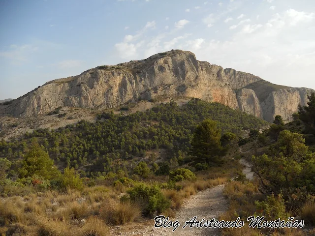 Desde el Collado del Cigarri continúo la PR en paralelo a la sierra sin perder altura dejando a la derecha la cima del Ponoig y acercándonos por la izquierda a la base del Puig Campana. Pero no llegaremos hasta el Coll (Collado) del Povet, puerta de acceso natural al citado macizo por su vertiente norte. Antes, un conveniente poste señalizador nos indicará una bella senda que nos adentrará en la sierra a través de un bello collado (que algunos planos denominan Collado del Llamp) que corta el cordel de la sierra literalmente dejando a la derecha la cima del Ponoig y a la izquierda una sucesión de espectaculares cimas de más de mil metros que terminan en el paraje denominado Pas de la Rabosa. En este collado se encuentra también otro poste con indicación de multitud de PR CV (13, 13.1, 17) no en vano nos encontramos en una de las zonas con más rutas y posibilidades de la Provincia de Alicante. Tomo la PR CV 13.1 que me llevará a la cima del Monte Ponoig, primero de los objetivos del día. La subida es un tanto escabrosa y la senda aparentemente se pierde en algunos tramos pero no reviste dificultad el encontrar el camino, si bien es inevitable girar la vista constantemente a la bella mole del Penyó Cabal que por la izquierda nos avisa que será nuestro próximo objetivo.