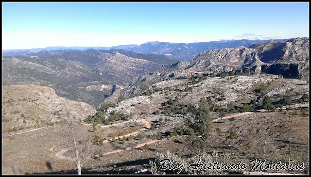 Por este lado de la derecha, se nos presenta el morro de una cumbre rocosa. Se eleva mucho por encima del collado donde muere la pista y se cubre todo de roca blanca, árida y quebrada. Por aquí remonté yo y al coronar lo más alto de un picacho que tiene encima un punto geodésico, me quedé paralizado frente a la impresionante vista que desde ahí se domina. Todo el barranco del río Guadalquivir casi desde que éste sale del Embalse del Tranco hasta que se pierde por Mogón, la gran loma de la sierra de Beas al otro lado de este profundo surco del río y también la ancha loma de olivares por Villanueva del Arzobispo, Iznatoraf y Villacarrillo hacia Úbeda. Se ve toda la carretera que atraviesa la Sierra de las Villas desde que pasa por el arroyo Martín hasta que se pierde por el collado del Ojuelo y claro que se dominan con absoluta claridad los barrancos, laderas, cortados y cumbres que va atravesando. Para la izquierda, se dominan las altas cumbres de la gran cordillera que viene desde Cazorla hasta el muro del Embalse del Tranco y por la Sierra de las Lagunillas, todas las crestas que coronan a Prao Chortales, Almagreros, cueva Buena y los legíos que caen para el muro del pantano. Al otro lado, quedan las cumbres del Yelmo pero ya muy lejos y los olivares, cortijos, pueblos y aldeas que por eso lares existen.