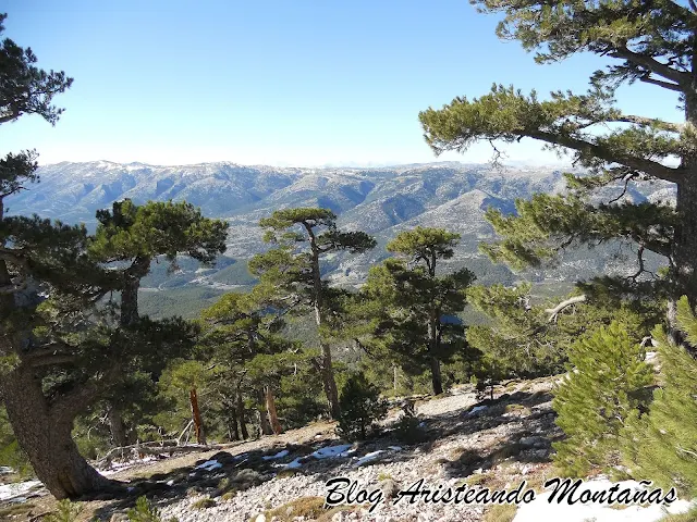 Desde el punto geodésico trazamos una linea por la arista de la montaña que nos bajará de ella por el Collado de la Sagra Chica. Desde aquí se inicia un vertiginoso descenso por el bello paraje denominado "El Bosque Vertical" y yo añadiría "gigante" pues se encuentran ejemplares de pino laricio soberbios. Luego ya por caminos completamos la circular de esta magnífica ruta en esta extraordinaria montaña.