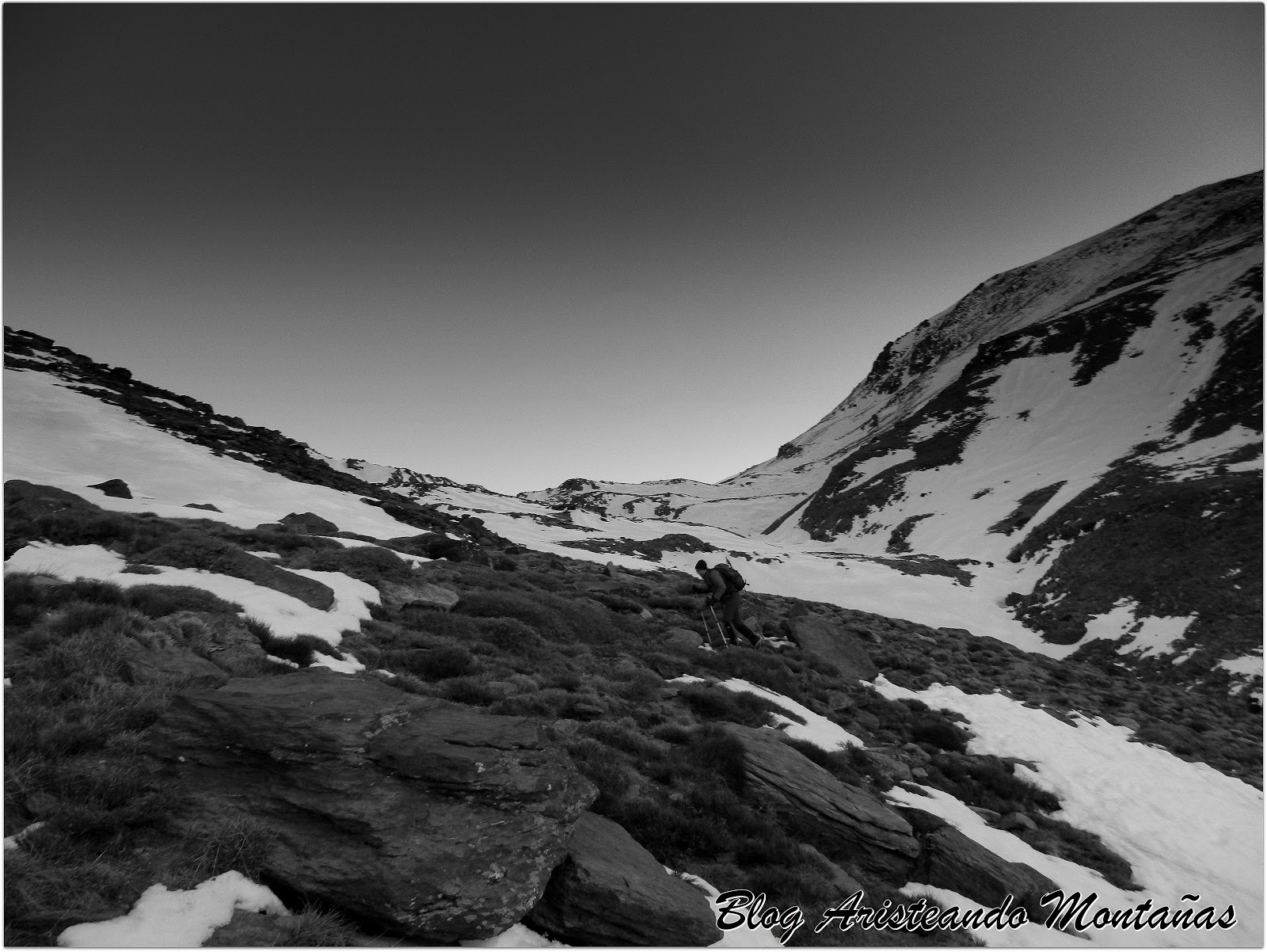 Llegados a La Puerta podemos comprobar como la pista que atraviesa la sierra, la que muchos denominamos la autopista del Mulhacén, se ha convertido en un vasar de escarpadas pendientes, a momentos heladas, con lo que tenemos que progresar ya de una manera mucho más alpina.
